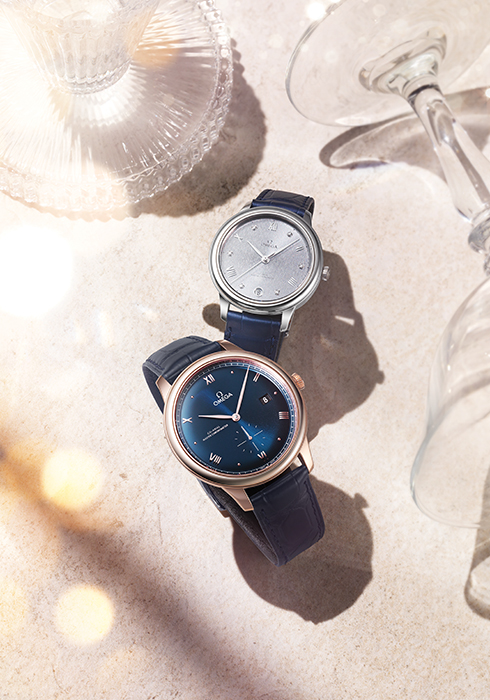 스테인리스 스틸 소재 케이스에 세로 형태의 스탬핑 랜덤 패턴의 PVD 라벤더 다이얼이 은은한 고급스러움을 선사하며, 로듐 도금 핸즈와 교차 배열한 로마숫자, 다이아몬드 마커로 디스플레이를 장식하고 6시 방향에 날짜창을 매치한 드 빌 프레스티지 코-액시얼 마스터 크로노미터 34MM 6백10만원, 18K 세드나™ 골드 소재 케이스와 태양광 패턴 마감 처리한 돔형 PVD 다크 블루 다이얼의 조화가 돋보이며, 3시 방향에 날짜창, 6시 방향에 스몰 세컨즈 서브 다이얼을 적용하고 55시간의 파워 리저브를 자랑하는 칼리버 8802 무브먼트를 장착한 드 빌 프레스티지 코-액시얼 마스터 크로노미터 스몰 세컨즈 41MM 1천6백70만원 모두 오메가. 문의 02-6905-3301