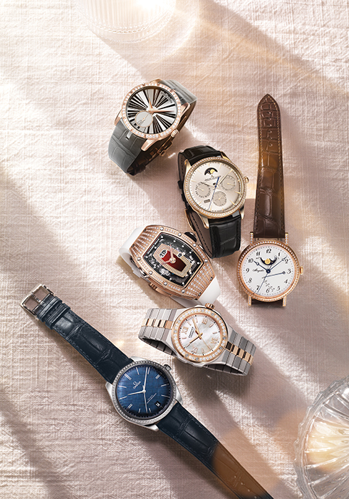 18K 핑크 골드 소재의 36mm 케이스에 화이트 다이아몬드로 베젤을 장식해 화려하면서도 기품을 드러낸다. 강렬한 로만 인덱스와 도피네 핸즈가 만나 대범한 디자인을 자아내며, 48시간 파워 리저브 기능의 오토매틱 RD830 칼리버를 장착한 엑스칼리버 36 에센셜 4천3백30만원 로저드뷔 02-3479-1403. 핑크 골드의 39mm 케이스와 브라운 가죽 스트랩의 조화로 고급스러움을 더했으며,오토매틱 와인딩 무브먼트인 예거 르쿨트르 칼리버 868로 구동하는 마스터 울트라 씬 퍼페추얼 캘린더 가격 미정 예거 르쿨트르 1877-4201. 39mm 로즈 골드 케이스에 그랑 푀 에나멜을 적용했으며, 베젤에는 0.72캐럿의 다이아몬드를 섬세하게 세팅했다. 12시 방향에 문페이즈, 3시 방향에 파워 리저브 인디케이터를 장착해 가독성과 디자인적 완성도를 높인 클래식 문페이즈 7788 4천9백만원대 브레게 02-6905-3571. 베젤과 케이스 백에 사용한 ATZ 화이트 세라믹과 미들 케이스에 적용한 화이트 골드 소재의 조합으로 고급스러운 디자인을 완성하고 다이아몬드를 촘촘하게 세팅해 화려함까지 더한 RM 037 가격 미정 리차드 밀 02-512-1311. 알프스와 강인한 독수리에게 영감받은 컬렉션답게 스포티한 실루엣이 제일 먼저 눈에 띈다. 여기에 0.81캐럿의 화이트 다이아몬드를 세팅한 베젤과 18K 로즈 골드 소재가 조화를 이뤄 세련미를 가미한 알파인 이글 36mm 3천3백55만원 쇼파드 02-6905-3390. 스테인리스 스틸 케이스와 다이아몬드를 파베 세팅한 베젤을 탑재한 40mm 모델로 6시 방향의 날짜창과 18K 화이트 골드로 제작한 핸즈와 인덱스를 갖춘 블루 패턴 돔형 다이얼이 클래식하면서도 도시적인 느낌을 연출하는 드 빌 트레저 코-액시얼 마스터 크로노미터 40MM 1천5백10만원 오메가 02-6905-3301.
