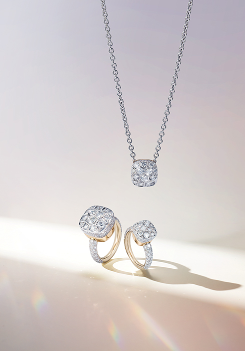 브랜드의 시그너처인 누도를 다이아몬드로 재해석한 디자인으로 18K 화이트 골드와 로즈 골드에 총 1.5캐럿, 48개의 다이아몬드를 세팅해 포인트를 준 누도 펜던트 네크리스, 같은 누도 컬렉션의 다이아몬드 링으로 18K 화이트 골드와 로즈 골드 소재에 총 1.8캐럿, 1백5개의 다이아몬드를 세팅한 링, 좀 더 볼륨감을 살린 디자인으로 18K 화이트 골드와 로즈 골드에 총 3.8캐럿 1백37개의 다이아몬드를 세팅한 누도 다이아몬드 링 모두 가격 미정 포멜라토. 문의 02-3143-9486