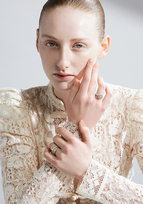이번 컬렉션 쇼에서 선보인 시그너처인 승마 룩 테마를 우아하게 담은 코튼 블렌드 레이스 소재의 재킷 가격 미정 디올 02-3280-0104. 오른손의 링은 플래티넘 소재에 2.2캐럿의 브릴리언트 컷 다이아몬드 1개를 세팅하고 주위에 브릴리언트 컷 다이아몬드를 파베 세팅해 극강의 화려함을 부여한 데스티네 솔리테어 링 가격 미정 까르띠에 1877-4326. 왼손의 링은 조세핀 황후를 모티브로 제작해 화려한 디자인이 돋보이는 링으로 플래티넘 소재에 브릴리언트 컷 다이아몬드와 1캐럿의 다이아몬드, 페어 컷 다이아몬드를 세팅한 조세핀 스플렌더 임페리얼 솔리테어 링 가격 미정 쇼메 02-3442-3359.