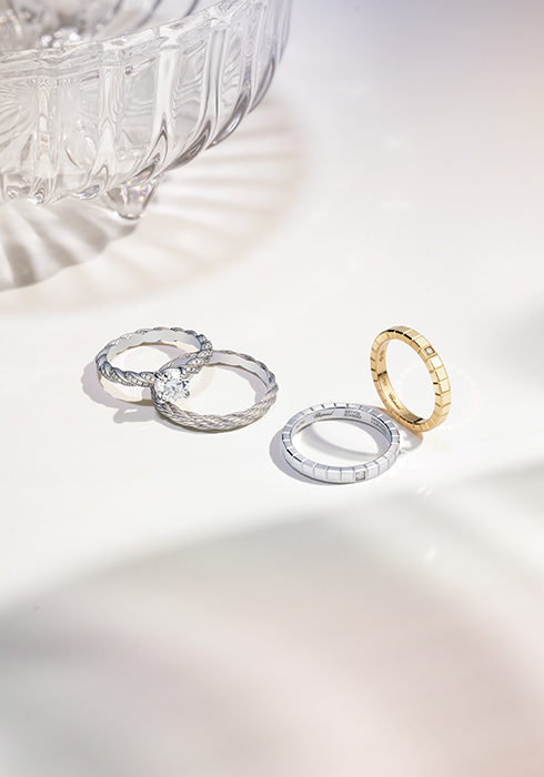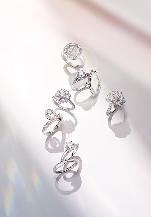 볼드한 디자인으로 강렬한 인상을 주는 2개의 원과 1개의 무빙 다이아몬드로 이뤄진 해피 스피릿 링 9백16만원 쇼파드 02-6905-3390. 2개의 정교한 플래티넘 브러시가 엇갈리며 사랑을 상징하는 눈부신 파베 세팅 다이아몬드의 인콘트로 다모레 링과 가드 링 가격 미정 불가리 02-2056-0170. 아름다운 사랑을 전하는 이브 피아제의 장미에서 영감받아 18K 화이트 골드에 98개의 브릴리언트 컷 다이아몬드 1.41캐럿을 파베 세팅해 활짝 핀 한 송이의 꽃을 그대로 재현한 로즈 링 1천7백만원대 피아제 1668-1874. 플라워 모티브의 디자인에 라운드 다이아몬드 총 2.19캐럿을 촘촘하게 세팅한 화이트 골드 세팅 링 2천7백33만원 그라프 02-2256-6810. 화이트 골드 소재에 0.77캐럿의 브릴리언트 컷 화이트 다이아몬드를 파베 세팅한 조세핀 아그레뜨 링 1천만원대 쇼메 02-3442-3359. 플래티넘 소재에 2캐럿 다이아몬드를 모던하게 세팅한 세팅 웨딩 링과 플래티넘 소재의 하모니 밴드 링 가격 미정 티파니 02-6250-8620.