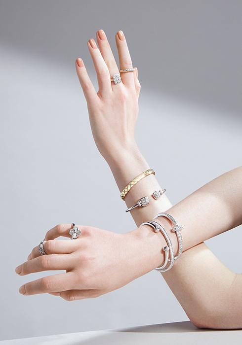 곡선미를 살린 모던한 스타일의 18K 로즈 골드 소재 밴드에 총 1.1캐럿의 38개 다이아몬드를 파베 세팅한 이코니카 링, 로즈 골드 밴드 위에 각기 다른 사이즈의 총 0.7캐럿, 34개 다이아몬드를 섬세하게 세팅한 스퀘어 형태의 모티브를 매치해 화려한 반짝임을 부여한 사비아 링 모두 가격 미정 포멜라토 02-3143-9486. 18K 베이지 골드로 퀼팅 모티브를 모던하고 심플하게 표현한 코코 크러쉬 브레이슬릿 1천2백50만원 샤넬 화인 주얼리 080-805-9628. 18K 로듐 플레이트 화이트 골드 소재의 밴드에 64개의 총 1.3캐럿 다이아몬드와 4.1캐럿 화이트 토파즈 1개, 6.5캐럿 화이트 토파즈 1개를 세팅한 누도 브레이슬릿 가격 미정 포멜라토 02-3143-9486. ‘T’ 자를 모티브로 한 18K 화이트 골드 밴드에 라운드 브릴리언트 컷 다이아몬드를 파베 세팅한 볼륨감 있는 스타일의 티파니 T1 와이드 풀 다이아몬드 힌지드 뱅글 가격 미정 티파니 02-6250-8620. 심플한 화이트 골드 밴드에 섬세한 비즈 장식과 다이아몬드로 눈부신 광채를 부여한 뻬를리 다이아몬드 브레이슬릿 3천3백만원대 반클리프 아펠 1877-4128. 18K 화이트 골드 밴드 양 끝에 자유롭게 회전하는 모티브를 더하고 30개의 브릴리언트 컷 다이아몬드를 매치한 오픈 뱅글 브레이슬릿 9백만원대 피아제 1668-1874. 브랜드의 상징적 표식인 네 잎 클로버를 그대로 재현한 기요셰 화이트 골드에 섬세한 비즈 장식과 다이아몬드를 더한 빈티지 알함브라 링 5백만원대, 브랜드 시그너처 장식인 클로버에 다이아몬드를 세팅하고 밴드 라인에 섬세한 비즈로 경쾌한 무드를 더한 뻬를리 스위트 클로버 링 1천만원대 모두 반클리프 아펠 1877-4128.