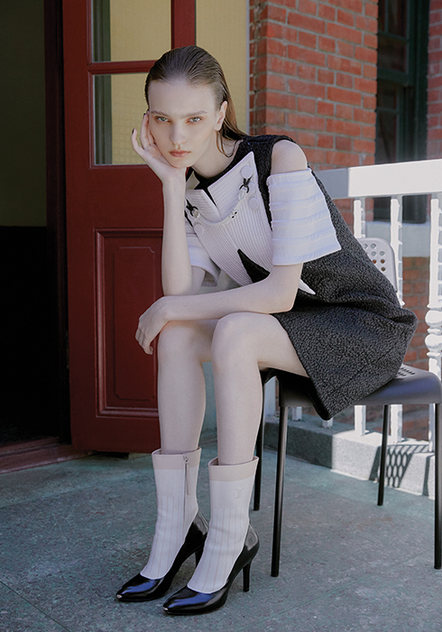 코튼 & 폴리에스터 소재의 블랙 & 화이트 컬러 포인티드 빕 드레스, 카프 스킨 소재의 일루전 앵클부츠 모두 가격 미정 루이 비통.