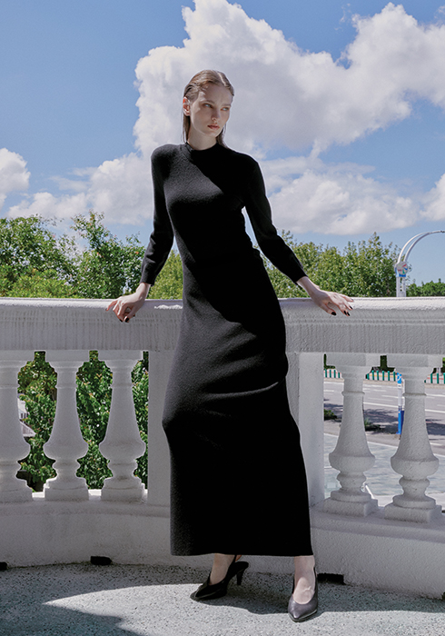 캐시미어 소재의 블랙 컬러 퀸스타운 원피스 4백85만원, 카프 스킨 소재의 블랙 컬러 레베카 발레리나 슈즈 1백16만원 모두 로로피아나.
