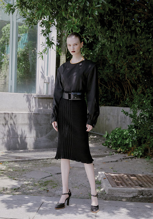 폴리에스터 & 코튼 소재의 블랙 컬러 블라우스 1백72만원, 버진 울 소재의 블랙 컬러 미디스커트 99만원, 레더 소재의 블랙 컬러 마이크로 백 벨트 86만5천원, 레더 소재의 블랙 컬러 도르세이 펌프스 1백48만원 모두 토즈. 골드 컬러의 오픈 링 네크리스 27만8천원 포트레이트 리포트.