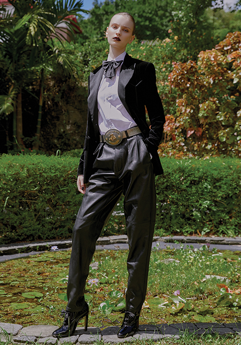 리퀴드 스트레치 벨벳 소재의 블랙 컬러 워커 재킷 5백20만원대, 브로드클로스 소재의 화이트 컬러 애스톤 셔츠 1백20만원대, 풀 보디 나파 램 스킨 소재의 블랙 컬러 로저스 팬츠 가격 미정, 페이턴트 소재의 블랙 컬러 홀튼 펌프스 가격 미정, 메탈 소재의 벨트 모두 가격 미정 랄프 로렌 컬렉션.