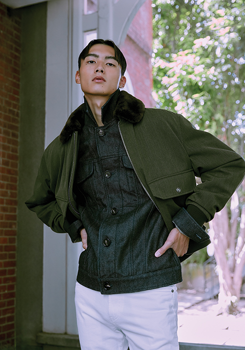버진 울 소재의 보틀 그린 컬러 후닌 보머 재킷 8백20만원, 코튼 캐시미어 데님 소재의 섀도 블루 컬러 캐주얼 재킷 6백53만원, 코튼 소재의 옵티컬 화이트 콰로나 5포켓 팬츠 1백10만원 모두 로로피아나.