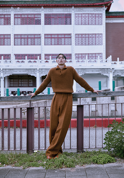 니트 소재의 브라운 컬러 니트 톱, 브라운 컬러의 와이드 팬츠 모두 가격 미정 제냐. 레더 소재의 브라운 컬러 슈즈 가격 미정 로에베.