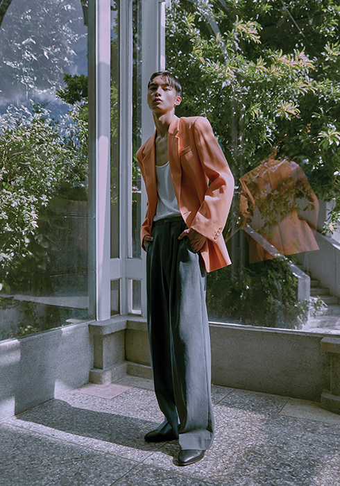 울 소재의 오렌지 컬러 싱글브레스트 재킷 4백20만원, 화이트 컬러 슬리브리스 톱 가격 미정, 울 소재의 그레이 컬러 팬츠 1백93만원, 레더 소재의 블랙 컬러 뮬 모두 가격 미정 구찌.