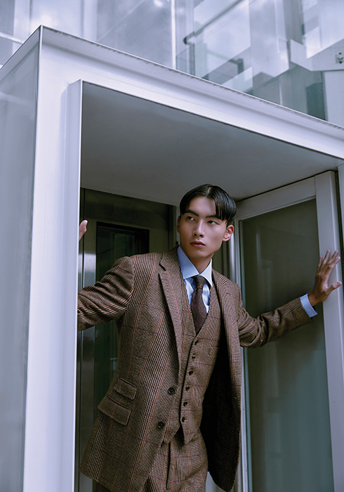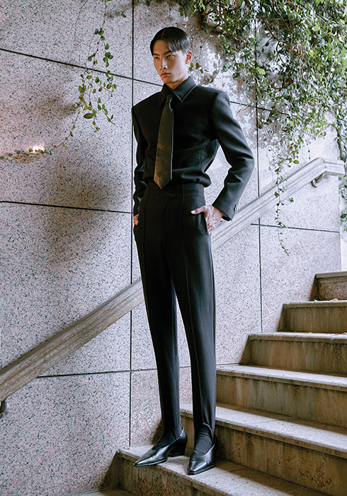 캐시미어 소재의 그레이 재킷 8백만원, 울 소재의 블랙 셔츠 1백44만원, 실크 & 캐시미어 소재의 브라운 터틀넥 2백48만원, 울 소재의 그레이 팬츠 1백41만원, 유광 카프 스킨 소재의 더비 슈즈 1백50만원 모두 에르메스.