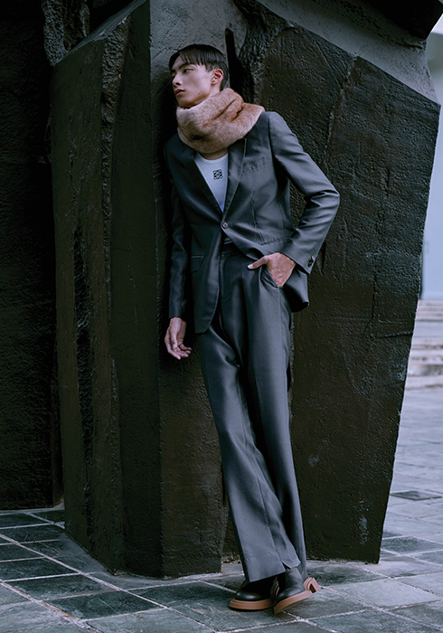 실크 소재의 차콜 컬러 테일러드 재킷 4백80만원, 실크 소재의 차콜 컬러 부트레그 트라우저 3백30만원, 화이트 컬러의 슬리브리스 톱 가격 미정, 카프 스킨 소재의 첼시 부츠 가격 미정, 페이크 퍼 소재의 넥 워머 가격 미정 모두 로에베.
