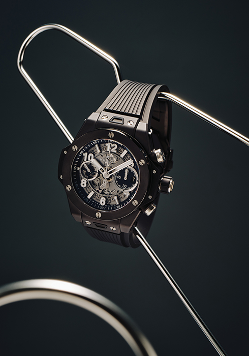 마이크로 블라스트 및 폴리싱 처리한 블랙 세라믹으로 완성한 44mm 케이스와 안감 처리한 블랙 스트럭처드 러버 스트랩의 조화로 세련미와 위엄을 자랑하는 빅뱅 유니코 블랙 매직 4천만원대 위블로. 문의 02-540-1356 |