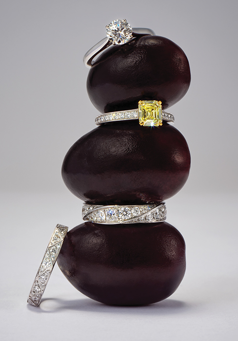 (위부터 차례대로) 플래티넘 밴드에 그라프 라운드 다이아몬드를 세팅한 파라곤 링, 1.07캐럿의 에메랄드 컷 옐로 다이아몬드를 세팅한 솔리테어 스타일의 플레임 링 모두 가격 미정, 스파이럴 형태로 다이아몬드를 세팅해 독특함을 부여한 화이트 골드 밴드 2천5백96만원, 구조적인 기하학적 모티브를 새긴 화이트 골드 밴드 위 패턴을 따라 다이아몬드를 파베 세팅한 로렌스 그라프 시그너처 컬렉션 링 1천1백39만원 모두 그라프. 문의 02-2150-2320 |