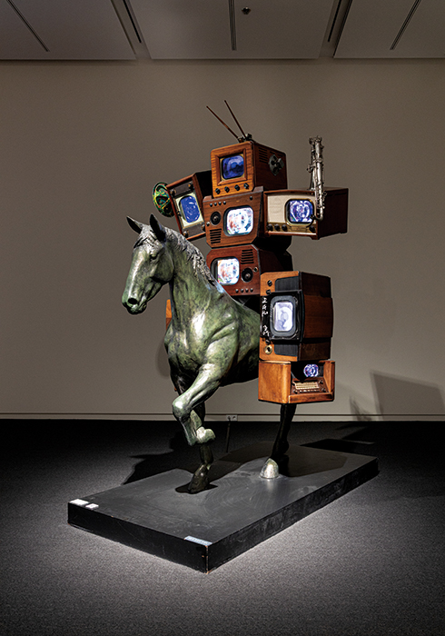 국내 최초의 사립 현대미술관인 우양미술관은 지난여름 새 단장을 마치고 다시 문을 열면서 APEC 정상 회의 개최를 기념해 특별전 <백남준: Humanity in the Circuits>를 선보였다. APEC에서 제안하는 ‘포용적이고 지속 가능한 미래-연결, 혁신, 그리고 번영’이라는 비전이 1980~90년대 테크놀로지를 인류 정신의 새로운 확장 가능성으로 바라보고 공동체적 사유를 본격화한 백남준과 철학적으로도 ‘접속’된다는 점에 주목했다. 이번 전시에서는 지난 20여 년간 미공개된 백남준 소장품을 면밀한 수복 작업을 거쳐 처음으로 대중에게 선보이고 있다. 주요작 중 하나는 국내 최초로 공개된 백남준의 비디오 설치 연작 ‘나의 파우스트’ 시리즈 중 ‘나의 파우스트 – 경제학’과 ‘나의 파우스트 – 영혼성’이다. 1989~91년 제작된 것으로 괴테의 고전을 바탕으로 한 작품이다. 우양미술관의 상징이었던 ‘고대기마인상’도 눈여겨볼 만하다. 1991년 개관을 앞두고 건축가 김종성이 설계하는 우양미술관 설립을 기념해 제작한 작품으로 경주에서 발굴된 고대 기마 인물형 토기를 모티브로 삼았다.