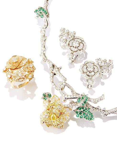 감각적인 컬러감의 옐로 다이아몬드로 장미를 장식하고, 에메랄드로 잎을 표현했다. 그리고 전체적으로 총 8.72캐럿의 다이아몬드를 세팅하고 화이트 골드 소재로 완성해 화려함을 더했다. 가격 미정. 문의 02-3280-0104