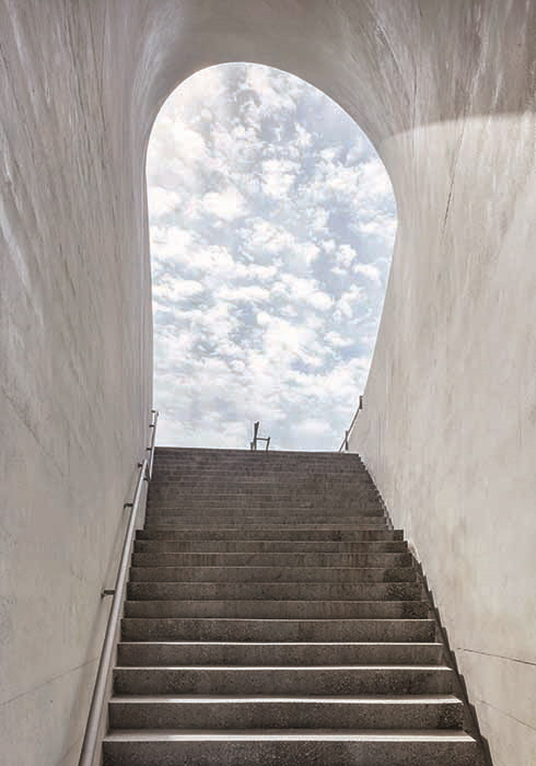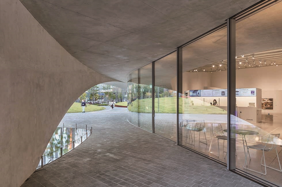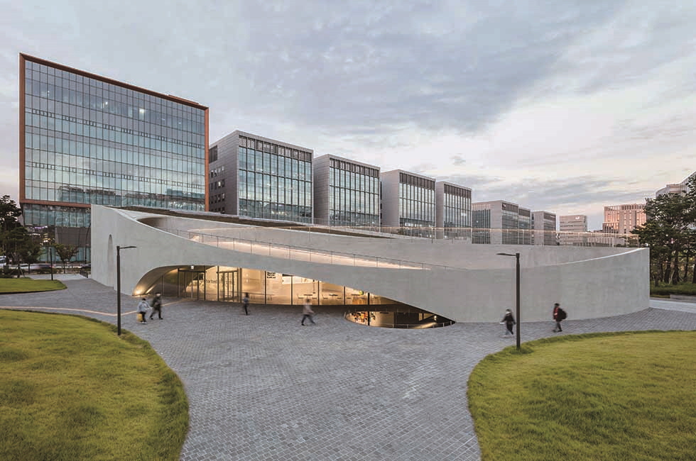 이는 미술관 건축의 정체성을 잘 보여주는 에피소드다. 옥상으로 이어지는 완만한 경사면과 부드러운 능선을 떠올리게 하는 아치형 문, 작은 분수, 하늘로 오르는 듯한 계단 등 스페이스K 서울은 사방이 하나의 조형 작품처럼 보이는 데다, 어디서나 부드러운 곡선을 만날 수 있으니 말이다. 내부에서 작품을 보는 방법도 독특하다. 2층으로 올라가면 네모난 창문같이 뚫린 공간이 있는데, 거기서 1층의 작품을 바로 눈앞에서 보는 것처럼 감상할 수 있다. 빛을 대하는 방식도 특별하다. 날카로운 그림자에 의한 빛의 대비를 최소화하기 위해 확산 기능이 있는 특수 유리를 전시장 천창에 적용했고, 미술관에서 전시를 보면서 공원을 내다볼 수 있도록 한 다양한 각도의 곡면 유리창을 설치했다. 지속 가능한 공간을 완성하기 위해 지열을 이용한 친환경 건축으로 지은 점도 주목할 만하다.