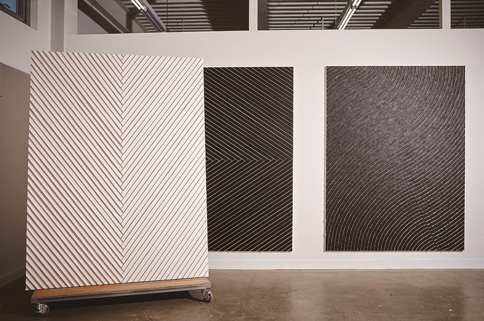 농사꾼의 아들로 어린 시절을 보낸 남춘모 작가가 구불구불한 밭고랑에서 영감을 받은 한국적 선(線)으로 주목받고 있다. 그의 작품은 광목을 단단하게 굳혀 작은 조형물을 만들고, 이를 캔버스 위에 붙이는 방식으로 완성된다. 선을 입체적으로 표현해 빛을 잘 받아들일 수 있도록 볼륨을 주는 것이다. 이는 건축적 형태의 추상화이면서, 드로잉이자 조각 작품이기도 하다.