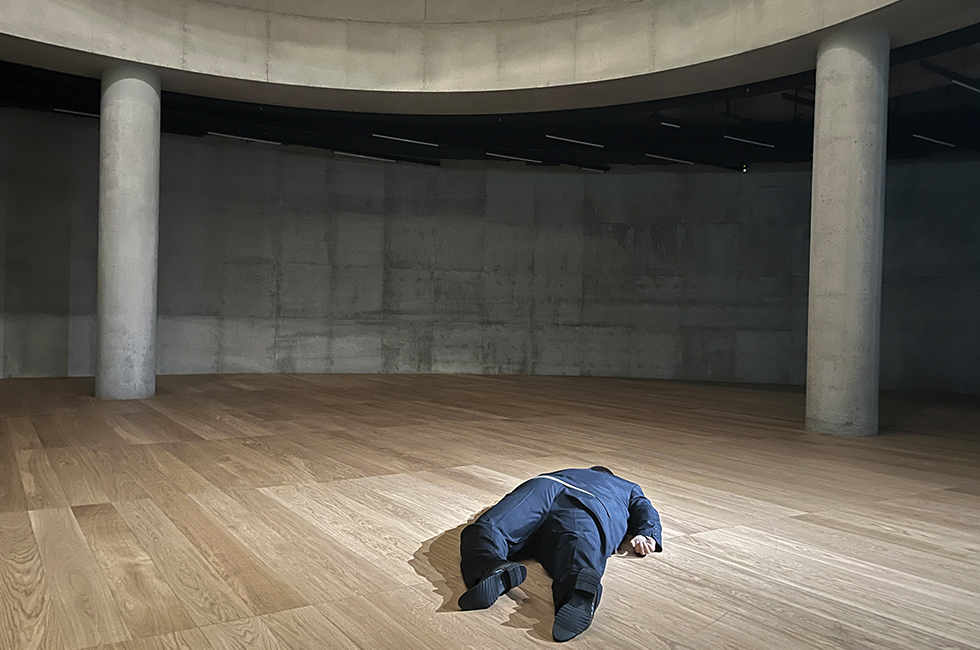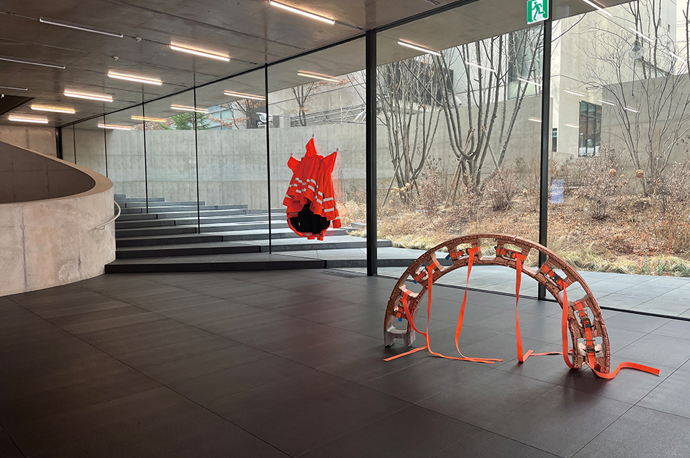 4 송은 전시장 1층에 아이웨이웨이(Ai Weiwei)의 작품 ‘Safety Jackets Zipped the Other Way’(2020)와 장쿤쿤(Zang Kunkun) 작품 ‘Upright (III)’(2018)가 놓여 있다.