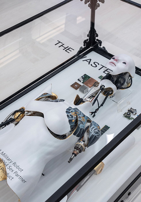 ‘리얼돌’ 이나 ‘섹스 로봇’ 같은 상품을 둘러싼 논란이 사회적 이슈로 떠오르기도 했지만, 우리의 일상은 이미 스마트 디바이스에 대한 의존도가 높다. 간단하게는 낯선 여행길에서 안내를 받고, 생일 알람을 설정하고, 실시간 정보를 제공받는 일상 풍경을 생각해보라. 일례로 최근 희소식을 전한 도쿄올림픽의 양궁 선수들도 현대차그룹의 인공지능 비전 기술로 자세와 약점을 분석해주는 ‘AI 코치’의 도움을 받았다. 강도를 좀 높여보자면 로봇은 인형처럼 생긴 가짜 베이비시터의 모습을 띨 수 있다. 또 우리에게 음식을 제공하고, 같이 쇼핑하고, 노인과 환자를 돌보기도 한다. 극단의 예로는 3관에서 소개한 댄 첸의 영상 작품 ‘생애 말기 돌봄 기계’(2012)를 들 수 있는데, 삶에서 가장 감정적으로 상처받기 쉽고 개인적인 경험인 ‘죽음의 순간’에도 자동화에 의존하는 사회의 단면을 그린다. 사망 직전 환자 곁에서 AI가 속삭인다. “나는 마지막 순간 로봇입니다. 나는 당신이 지구상에서 마지막 순간을 가장 잘 보낼 수 있도록 도움을 드립니다. 유감스럽게도 당신의 가족과 친구들은 지금 여기에 올 수 없습니다. 그렇지만 두려워하지 마세요. 제가 있습니다.” 지구를 떠나더라도 지인들이 기억할 것이라고 보듬는 AI의 ‘손길’ 속에서 환자는 미소를 띤 채 세상을 뜬다(AI의 인간다운 행위에 무의식적으로 인격을 부여하는 ‘일라이자 효과’에 다름 아니다). 지능형 로봇에 대한 의존도가 극심한 풍경이 슬프긴 하지만, 마치 ‘친구’처럼 선의의 보살핌을 건네는 존재가 필요하리라는 생각이 드는 동시에 ‘관계’를 맺게 되면 결국 로봇의 상실 역시 우리를 아프게 하리라는, 영화 <서복> 같은 시나리오가 절로 떠오른다.