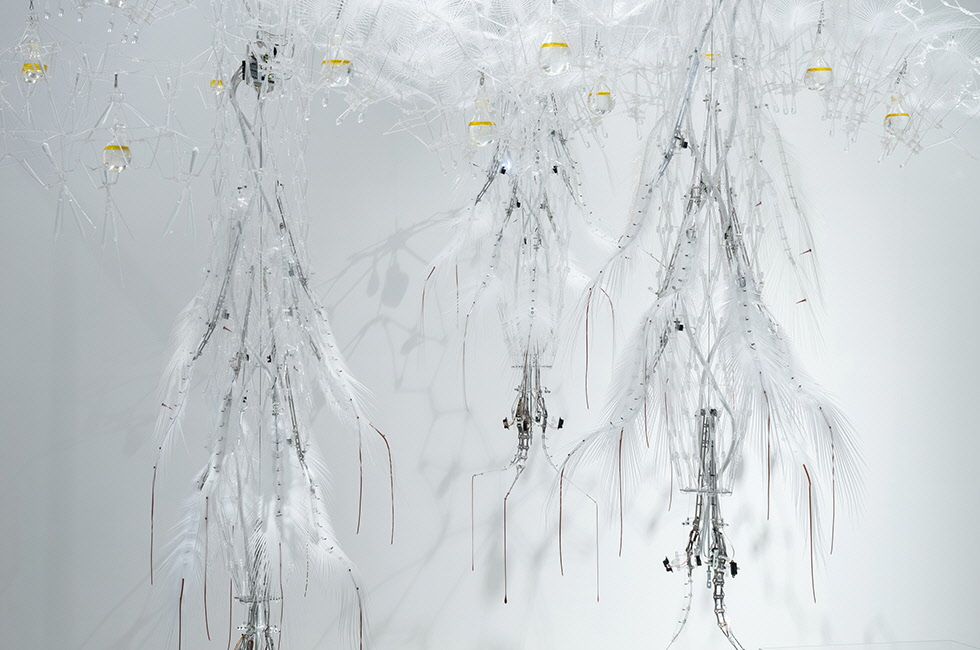 사실 ‘필요성’을 운운하는 건 뒤늦은 질문일 수 있다. 현대인 대다수는 ‘로봇’이라고 하면 <스타워즈>의 R2D2나 <월E>의 월E 같은 영화 속 캐릭터를 떠올릴 정도로 대중문화가 선사한 ‘이미지’에 빠져 있다. 하지만 우리 일상에는 이미 로봇이 도처에 스며들어 있다. 1관에 전시되어 있듯, 드론에서 셀프 계산대, 나노 로봇, 로봇 청소기, 쇼핑용 챗봇 등 아주 다양한 로봇과 로봇 시스템에 둘러싸여 있다. 레이 커즈와일이 정의한 ‘의식을 가진 뇌’로서의 ‘마음’을 품은 초지능 로봇 수준에 아직 이르지는 못했을지언정 말이다. 전시 큐레이터는 불과 10년여 전만 해도 ‘인간에게 정말로 스마트폰이 필요한가?’라는 질문에 대부분 ‘아니다’라는 답을 했다고 지적한다. 1관에 전시된 에릭 피커스길의 사진 작품 시리즈 ‘제거’(2014)가 보여주듯 우리는 이미 ‘기술 중독’의 현실을 살고 있다. 스마트 기기 부재 시 인간이 저도 모르게 취하는 행동을 포착해낸 이 작품에서 아이나 어른이나 할 것 없이 빈손에도 여전히 ‘폰’을 잡고 있는 듯한 포즈를 취하고 공허한 시선을 보이는 모습이 섬뜩한 느낌이 들게 한다. 이렇게 스마트폰이 우리 일상에서 필수불가결한 존재가 된 것처럼 머지않은 미래에 ‘아바타’ 같은 각자의 로봇이 생길지 누가 알겠는가?