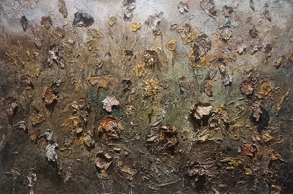 2층 전시 공간의 중앙에는 1백18개의 홍토 벽돌로 만든 ‘집(설치 작품)’이 있다. 4면 벽의 일부만 남아 있는 이 집은 짓다가 멈춘 것인지, 아니면 세월에 의해 허물어진 폐허인지 알 수 없다. 허물어진 만큼 그 흔적은 더욱 아련하다. 이 설치물은 대형 회화 작품들로 둘러싸여 있다. 오롯이 집중해보자. 릴케의 시와 그 운율이 그대로 그림으로 시각화되면서 어느새 관람객은 깊어가는 가을 한가운데 놓인다. 비 온 뒤 숲속의 낙엽 냄새가 진하게 느껴지며 후각화된다. 캔버스 위 입체적인 낙엽은 금방이라도 가을바람에 휘날려 날아갈 듯하고, 나뭇가지에 붙어 있던 잎들은 떨어져 관람객의 발 앞으로 굴러올 듯하다. 숲속으로 좀 더 깊이 들어가기 위해 작품 앞으로 한 발자국 가까이 다가가면 낙엽 밟는 소리가 들리는 듯 청각화된다.