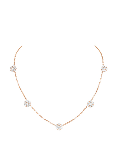 자연에 대한 예찬을 담은 주얼리로 늘 놀라움을 주는 반클리프 아펠에서 새로운 네크리스를 출시한다. 반클리프 아펠의 상징적인 플로레뜨(Fleurette) 모티브가 로즈 골드 소재로 재탄생한 것. 7개의 라운드 다이아몬드로 이루어진 눈부신 자태의 화관 5개로 완성했으며, 세심한 오픈워크, 세팅과 폴리싱 기법 등을 적용해 실제로 봤을 때 더 강렬한 광채를 내뿜는다. 로즈 골드가 네크라인 위에서 은은한 피부 톤과 자연스럽게 어우러지는 모습을 목격할 수 있을 것. 간결한 실루엣으로 어느 룩에나 잘 어울리는 것은 큰 장점이다. 룩에 은은한 포인트가 될 네크리스가 필요하다면 단연 반클리프 아펠의 플로레뜨 네크리스를 추천한다.