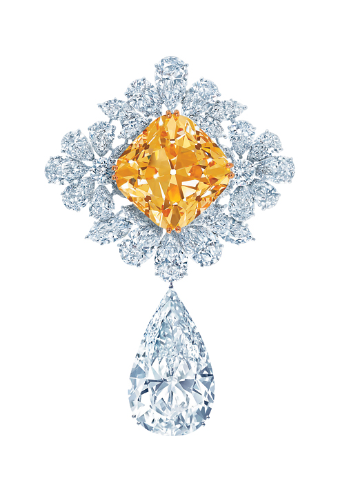 펜던트 혹은 브로치로 착용 가능한 ‘로얄 오브 스타 파리’ 는 1백7.46캐럿의 팬시 옐로 쿠션 컷 다이아몬드인 ‘그라프 썬플라워’와 1백 캐럿 D FL 페어 셰이프 다이아몬드 드롭인 ‘그라프 퍼펙션’으로 이루어진 제품으로 시선을 끌었다.
