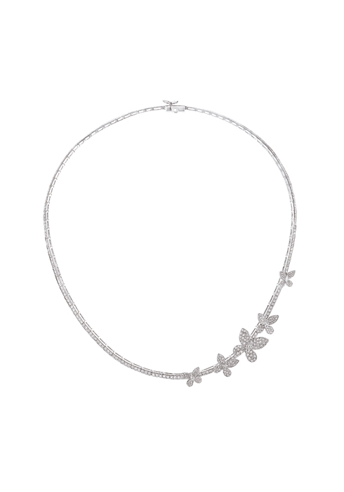아름다움을 향한 헌신과 디테일을 향한 집념, 공예 기술을 향한 끝없는 도전을 바탕으로 늘 창조적이면서도 놀라운 주얼리를 선보이는 하이 주얼러 그라프. 특히 자연에서 영감받은 와일드 플라워나 버터플라이 컬렉션은 마치 실제로 살아 있는 꽃과 나비인 듯 생동감 넘치는 디자인으로 주목받는다. 가장 최근에 그라프에서 선보인 피스는 버터플라이 컬렉션의 네크리스. 버터플라이 컬렉션 멀티 셰이프 파베 다이아몬드 네크리스로 화이트 골드 소재에 총 5.85캐럿의 라운드 컷과 마키즈 컷 다이아몬드를 사용해 완성한 5마리의 나비가 돋보인다. 나비의 사이즈와 위치를 불규칙적으로 배치해 마치 날아오르는 듯 생생한 감성을 표현했으며, 섬세하고 디테일한 세팅이 돋보인다. 무수한 다이아몬드로 볼륨감 또한 만족시켜 룩에 포인트를 주기에도 충분하다. 8천3백49만원. 문의 02-2256-6810