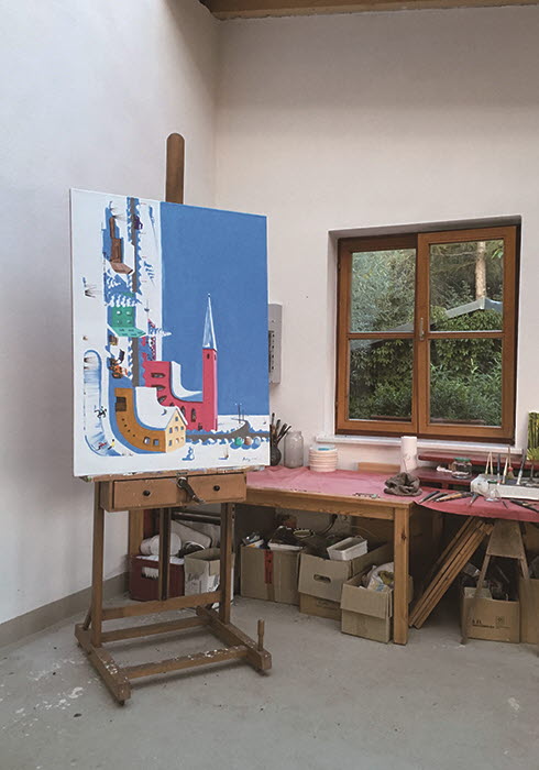 음영을 달리한 강렬한 파란빛 산, 작은 설렘이 묻어나는 낭만적인 연주홍빛 들판, 보라색과 핑크색이 발랄하게 어우러진 시골길, 회색의 미를 최대치로 뽑아낸 듯한 안개 낀 마을 풍경…. 페터 앙거만(Peter Angermann)의 풍경화를 응시하다 보면 파버카스텔 색연필이 떠오른다. 고운 틴 케이스에 가득 담긴 유채 색연필의 다채로운 색상을 마치 ‘순간의 체험’에 빠져든 어린아이처럼 순수하게, 자신만의 감성으로 캔버스에 맘껏 풀어낸 느낌이랄까. 그렇듯 천진하고 자유로운 동심이 흐르면서도 어딘가 품격 있는 절도가 느껴진다. 시끄럽고 복잡한 속세를 떠나 살면서 수십 년을 한결같이 한 고장의 풍경을 담아온 노장만이 가질 수 있는 내공의 소산이 아닐까 싶다. 23년 전인 1995년, 화단에서 맹렬히 활약하던 그가 전원생활을 택하면서 자리 잡은 둥지는 독일 남동부 투른도르프(Thurndorf)의 한 마을. 흥미롭게도 2백50년이 넘는 유구한 전통을 자랑하는 파버카스텔의 본사가 있는 독일 뉘른베르크(Nu··rnberg)에서 자동차로 1시간 정도면 닿을 수 있는 곳으로, 뜻풀이를 하자면 ‘백리향 마을’이다. 녹음(綠陰)의 축복을 만끽하느라 지루할 새도 없이 시골길을 따라가다 보니 어느덧 마을 전체가 한눈에 내려다보이는 언덕배기에 자리 잡은 페터 앙거만의 자택이자 스튜디오에 도착했다. 프랑코니언 지방의 색채라는 따뜻한 노란색 벽과 짙은 벽돌빛 지붕, 그리고 마당에는 소담스러운 정원과 작은 연못까지. 그야말로 풍경을 그리기에 안성맞춤인 곳이다.