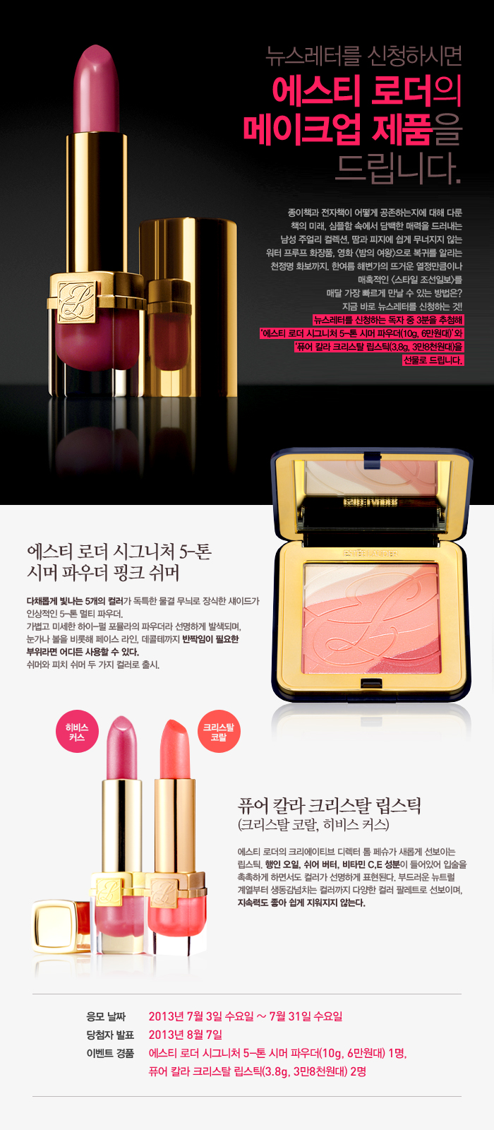 뉴스레터를 신청하면 에스티 로더 메이크업 제품을 선물로 드립니다 작성일자: 7월 03, 2013 글쓴이: stylechosun 조회수: 2720 7월 03, 2013 회원 가입하신 후 뉴스레터 신청을 하시면 이벤트 참여가 이루어지며, 기존 가입자는 뉴스레터 신청 버튼을 눌러 신청하시면 이벤트 참여가 이뤄집니다. 회원 가입시 주소와 연락처(전화번호)를 꼭 남겨주세요. 글 네비게이션 이전글아비노와 함께하는 액티브 내추럴 피부 회복 프로젝트 다음글시세이도 넘버원 자외선 차단제 이벤트 발표