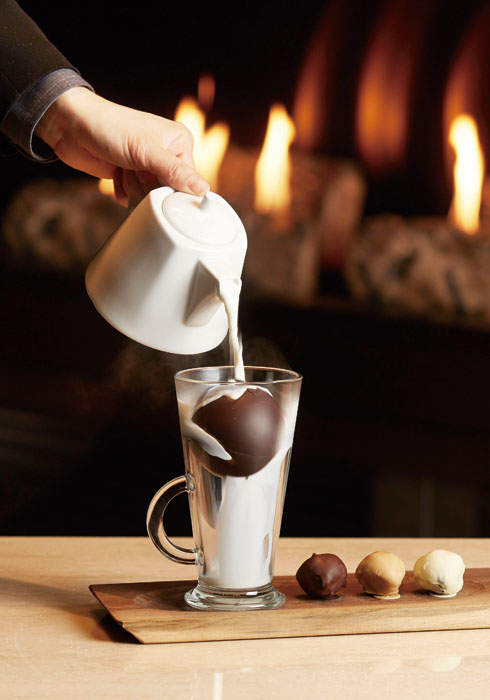 ◀ 콘래드 서울에서 내년 2월 말까지 선보이는 디저트 드링크 ‘시그니처 핫초콜릿’. 뜨거운 우유를 부으면 프랑스 수제 초콜릿 볼이 녹아내린다.
