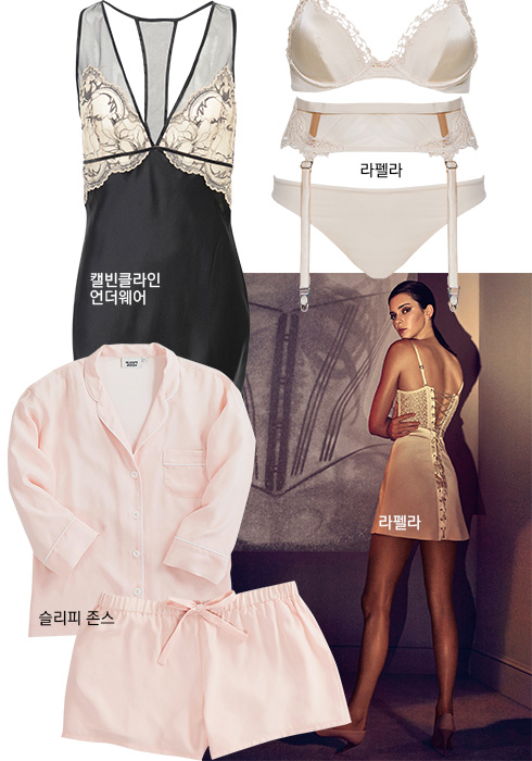 허니문 란제리의 정석은 역시 로맨틱 무드다. 여기, 특별한 허니문을 위해 캘빈클라인 언더웨어(Calvinklein Underwear)에서 추천하는 ‘임브레이스 슈미즈 컬렉션 슬립웨어’를 주목해보자. 이는 블랙과 화이트의 절제된 컬러에, 어깨와 쇄골 라인이 훤히 비치는 시스루 소재와 레이스 장식을 더한 매혹적인 디자인으로, 레이스 사이로 스킨이 은은하게 비치면 더할 나위 없이 섹시하다. 이와 함께 럭셔리하고 관능미를 강조한 디자인이 주를 이루는 하이엔드 란제리 브랜드 라펠라(La Perla)도 눈여겨보자. 라펠라는 은밀한 영역에 머물렀던 란제리 룩을 ‘럭셔리’라는 이름으로 재탄생시킨 브랜드. 1954년 이탈리아 볼로냐의 작은 코르셋 가게에서 시작한 라펠라는 파격적인 비주얼, 독창적이면서도 대담한 디자인으로 전 세계 여성들을 사로잡았다. 튈과 레이스, 실크 등의 섬세한 소재와 핸드메이드로 완성한 탁월한 퀄리티가 여성들의 감춰져 있던 욕망을 만족시키고 럭셔리 란제리의 범위를 넓혔다는 긍정적인 평가를 받는다. 과감한 란제리를 통해 섹시한 여성으로의 변신을 꿈꾼다면, 라펠라와 함께하는 새로운 경험에 도전해볼 것. 마지막으로 해외에서 인기 있는 유쾌한 파자마 패션을 소개하는 슬리피 존스(Sleepy Jones)를 편집 숍 마이분과 비이커를 통해 한국에서도 만나볼 수 있다는 소식! 슬리피 존스는 피카소를 비롯, 많은 아티스트가 작업할 때 수트와 타이를 벗어 던졌다는 사실에서 착안해 ‘쉬면서 생활하자’를 모토로 2013년 미국에서 론칭한 브랜드다. 라운지웨어, 슬립웨어, 언더웨어를 중심으로 남녀 아이템을 선보이는데, 침대뿐 아니라 일상생활을 위한 파자마라는 독특한 콘셉트를 지닌 컬렉션이다. 거리에서도 파자마 셔츠에 데님 팬츠를 매치하는 등 ‘파자마 룩’을 즐길 수 있다는 점도 매력적.