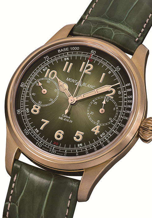 이 시계는 1930년대의 미네르바 크로노그래프에서 영감을 받아, 몽블랑 컬렉션 중 최초로 브론즈 케이스에 빈티지 그린 다이얼과 그린 컬러의 악어가죽 스트랩을 조합한 특별한 디자인을 적용한 제품이다.