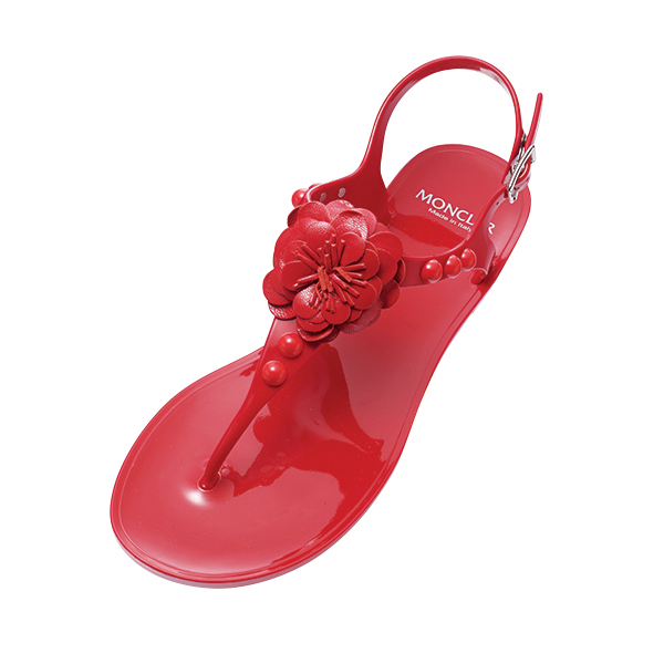 꽃 장식을 더한 강렬한 레드 색상의 T 스트랩 젤리 샌들