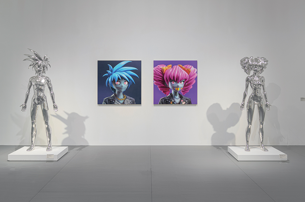 ©Takashi Murakami/Kaikai Kiki Co., Ltd. All Rights Reserved. Courtesy of the artist and Perrotin. 각각의 이미지에서 ‘꽃’ 시리즈(2번), ‘무라카미 좀비와 폼 좀비’(2022), ‘클론 X x 무라카미 다카시‘(2022) 등의 작품이 보인다. 작가가 오타쿠 문화