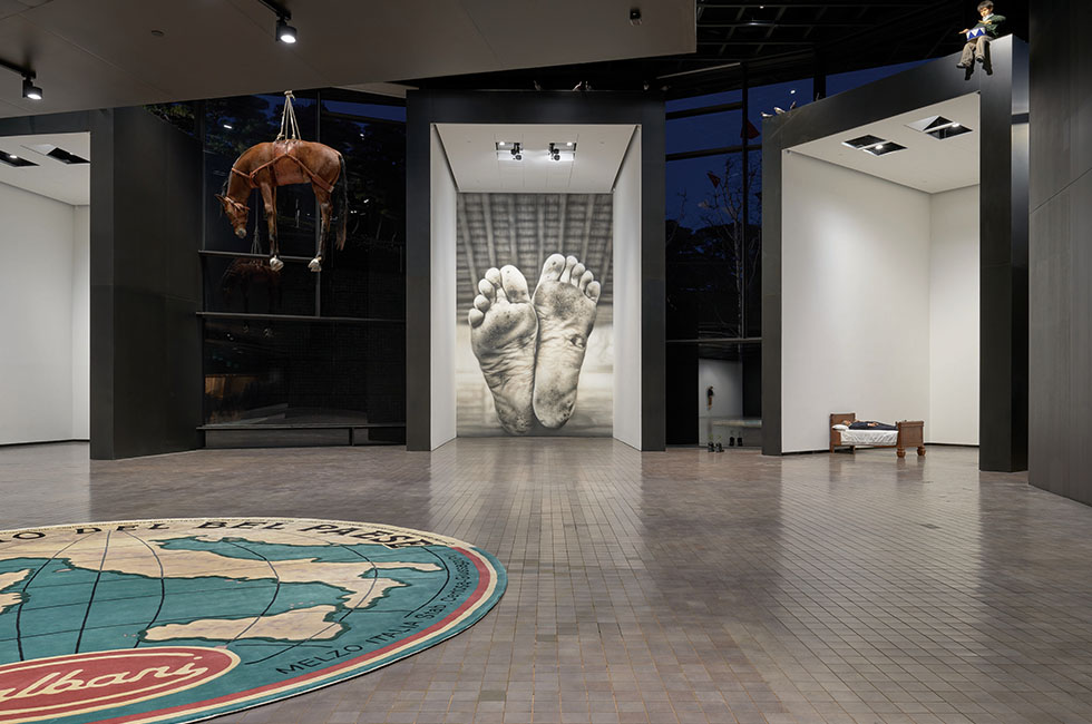 7 리움미술관에서 진행 중인 이탈리아 출신의 세계적인 개념 미술가 마우리치오 카텔란의 <WE> 전시 풍경. Courtesy of Maurizio Cattelan, 사진 김경태 Kim Kyoungtae. 이탈리아 지도가 그려진 바닥에 깔린 원형 카펫에는 ‘FORMAGGIO DEL BEL PAESE’라는 문구가 적혀 있다. ‘포르마지오’는 이탈리아 국민 치즈 브랜드이고 ‘벨 파에제’는 ‘아름다운 나라’라는 표현. 1994년 전시됐을 당시엔 관람객들에게 짓밟혀 얼룩투성이가 됐지만 이번 전시에서는 ‘아름다운 나라’를 소개하는 상품의 논리와 복잡다단한 국가적 정체성을 반영해 밟지 못하도록 설치됐다.