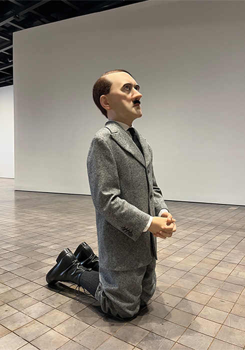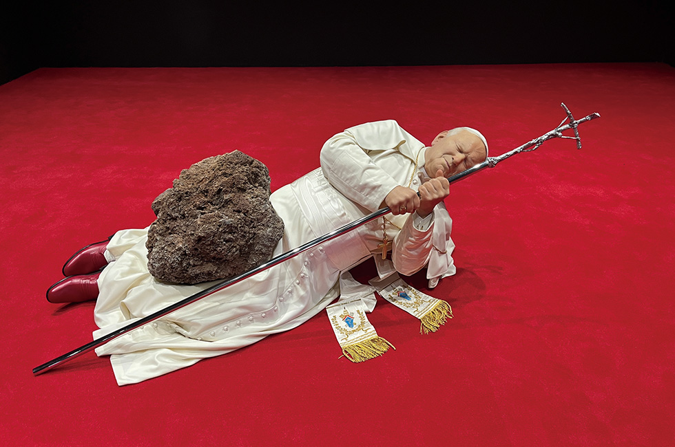8 제2차 세계대전 때 유대인 학살을 주도한 아돌프 히틀러의 얼굴을 한 남자가 무릎 끓고 기도하는 모습이 왠지 섬뜩한 카텔란의 작품 ‘그’(2001). 히틀러는 세상에 없지만 학살과 혐오의 역사가 되풀이되는 우리네 현실을 자각하게 만든다. 9 마우리치오 카텔란, ‘아홉번째 시간’(1999). 운석에 맞아 붉은 카펫 바닥에 쓰러져 있는 요한 바오로 2세(작품 제작 당시의 교황)의 모습이 사뭇 강렬하다. 사회적 관행과 질서, 권위와 신념을 재고하게 만든다. ※ 6, 8, 9 photo by SY Ko