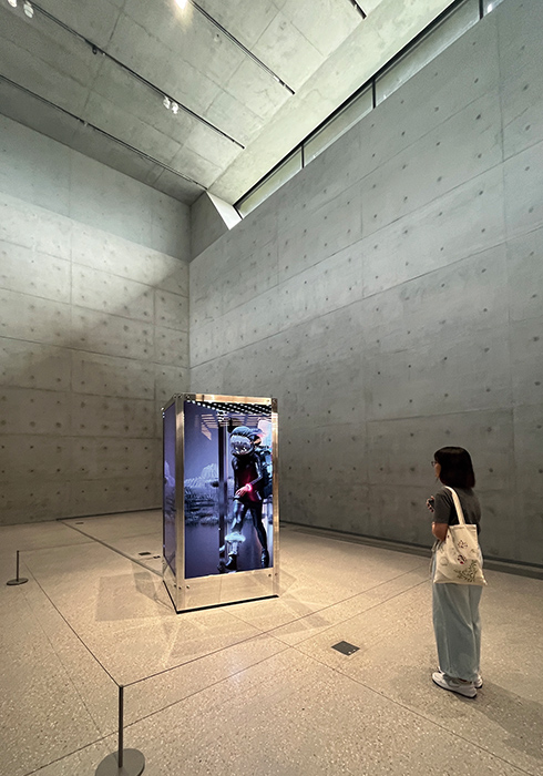 2 M+ 포커스 갤러리(Focus Gallery)에 설치된 비플(Beeple)의 작품 ‘HUMAN ONE’을 감상하고 있는 관람객.
