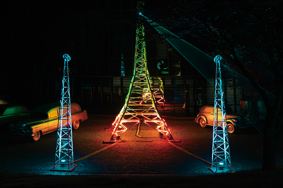 20년 만에 국내에 첫 공개된 ‘트랜스미션 타워’는 클래식 자동차 5대, 모차르트의 진혼곡과 함께 백남준아트센터 뒤뜰에서 선보였다(12월 3일까지 백남준아트센터에서 열리는 특별전 <트랜스미션: 너에게 닿기를> 전시의 일환). 레이저와 네온이 만들어내는 빛도 신비롭지만, 백남준을 오마주한 윤제호 작가의 레이저와 사운드 디자인이 더해지며 현대성이 증폭되었다. 먼 우주에서 오는 주파수 같은 사운드와 함께 타워의 레이저가 숲과 언덕에 쏟아질 때 오로라가 펼쳐지는 북유럽 어딘가에 와 있는 듯하기도 하고, 막막한 우주에서 행성을 보는 것도 같다. 그리고 이런 생각을 하게 된다. ‘백남준의 끝은 어디까지일까’라는. 그리고 우리는 백남준이 레이저 빛으로 상상했던 정보 시대에 살고 있지만, 그의 예견처럼 인간과 기술이 균형을 이루는 환경에서 잘 살아가고 있는지 생각해보게 된다.
