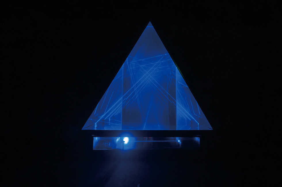4 ‘삼원소: 삼각형’(1999). 백남준이 레이저 전문가 노먼 발라드와 함께 제작한 작품으로 2000년 뉴욕 구겐하임 미술관에서 열린 회고전 <백남준의 세계>에서 처음 전시되었다. 이미지 제공_백남준아트센터