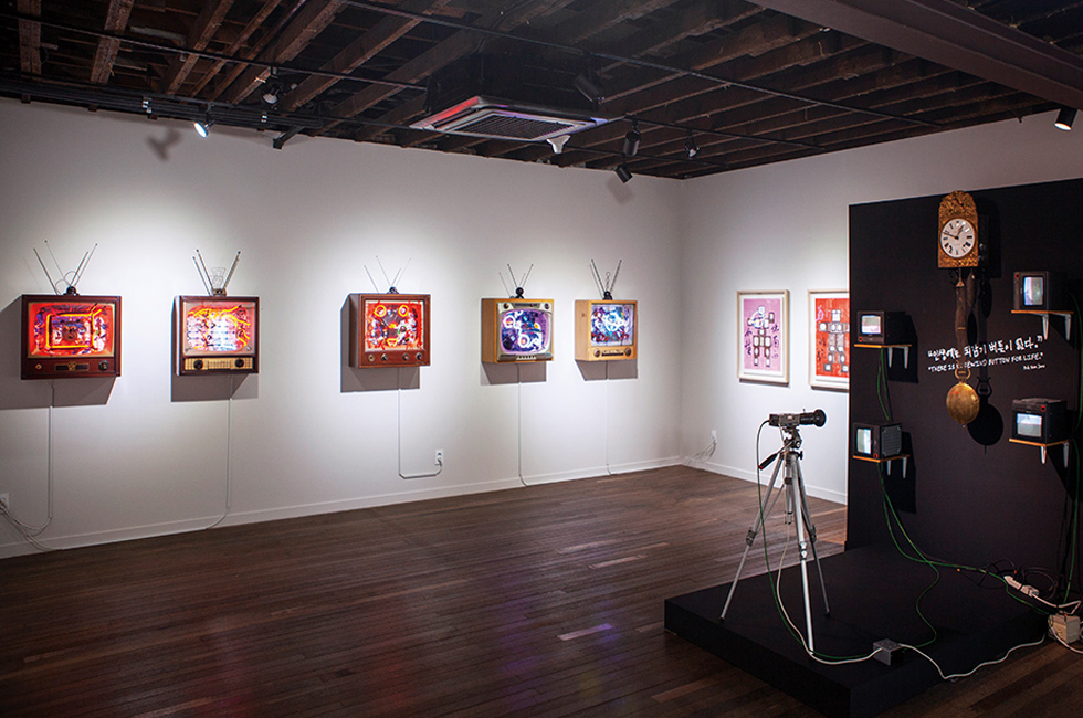 5~6 두손 갤러리에서 열리고 있는 백남준의 전시 <I never read 1984> 풍경. 자연, 인간, 기술이 모두 녹아 있는 이번 전시는 포스터부터 판화, 드로잉, 사진 작품까지 볼 수 있다. 기술과 자연이 서로 순환을 이루는 예술의 아름다움을 보여준다.