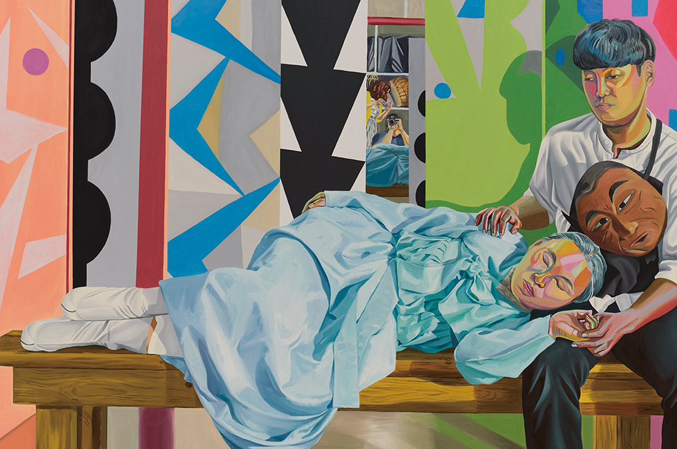 4 알리자 니센바움은 광주 지역 놀이패 ‘신명’과 협업, 5.18로 상실의 아픔을 겪은 이들의 이야기를 담은 마당극 리허설 장면을 화폭에 담았다. 배우와 그들이 연기하는 인물의 중첩은 개인과 집단의 서사/기억의 초상이다. ‘신명, ‘어느 봄날’, 드레스 리허설’(2022). 작가·뉴욕 안톤 컨 갤러리 제공. 사진: 토마스 바렛. © 알리자 니센바움
