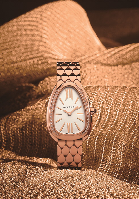 뱀 머리를 연상시키는 지름 33mm의 삼각형 골드 케이스와 뱀 비늘 모티브 링크가 연결된 브레이슬릿의 조합이 대담하고 우아하다.