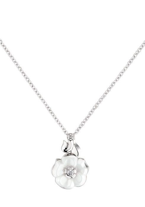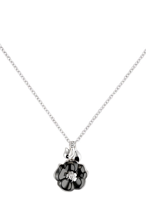 화이트 골드와 블랙 세라믹으로 만든 펜던트가 달린 까멜리아 갈베 컬렉션 네크리스. 까멜리아 중앙과 펜던트와 체인이 만나는 곳에 다이아몬드를 세팅했다. 화이트 골드와 화이트 세라믹 버전으로도 출시한다.