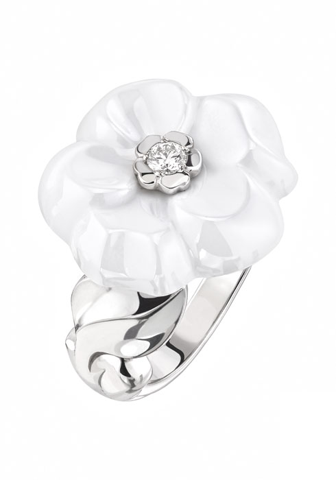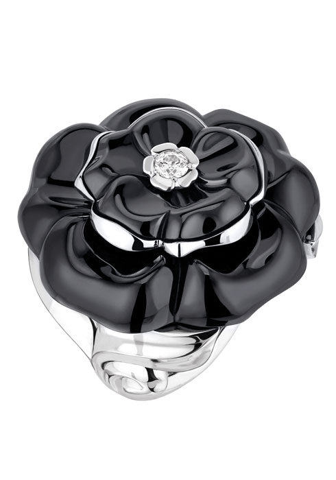 화이트 골드, 블랙 또는 화이트 세라믹으로 만든 꽃잎 중앙에 다이아몬드를 세팅한 까멜리아 갈베 컬렉션 링. 둥글려진 까멜리아 잎사귀 형태라 편안함 착용감을 선사한다. 라지와 스몰 두 가지 사이즈로 선보인다.