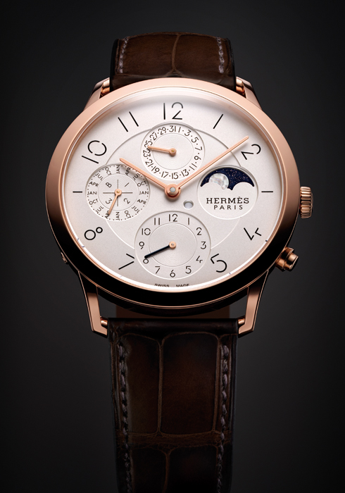 에르메스에서 천연 화이트 자개와 사금석으로 장식한 문페이즈가 고급스러운 ‘슬림 데르메스 퍼페추얼 캘린더’를 선보인다.