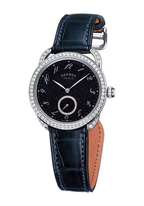 별이 빛나는 밤하늘을 보는 듯한 느낌을 주는 어벤츄린 다이얼의 6시 방향에 자리 잡은 스몰 세컨즈는 28개의 다이아몬드로 둘러싸여 화려함을 뽐낸다.
