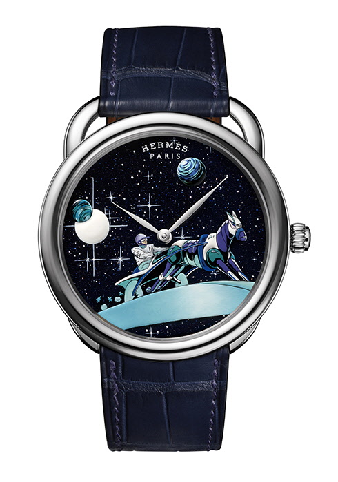 1978년 앙리 도리니가 디자인한 아쏘 워치 다이얼 위로 일러스트레이터 위고 비앙브니의 수공예 미니어처 페인팅을 더했다. 모티브가 된 그림은 20세기 미국 만화책 속 슈퍼 히어로에서 영감을 받아 상상 속 우주 승마 팀의 모습을 표현한 스페이스 더비 실크 스카프에서 차용했다. 별들 사이로 경주하는 말, 미스터리한 행성과 별자리, 우주 궤도를 전속력으로 질주하는 기수와 같이 미래적이고 다채로운 세계를 담았다.