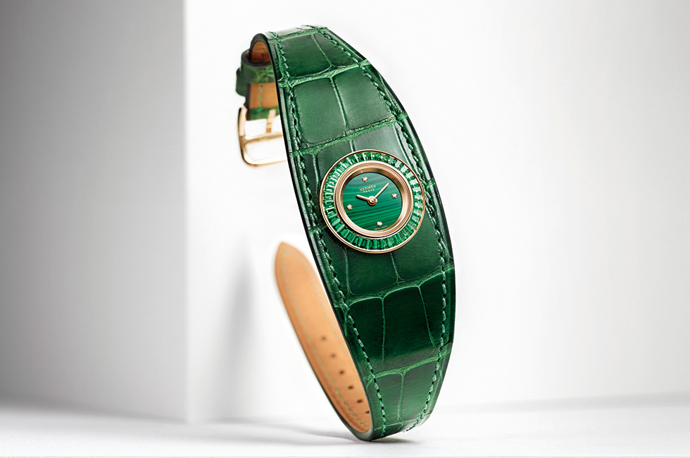 에르메스는 유려한 곡선의 가죽 스트랩과 보석 세팅이 멋스러운 여성 워치 ‘포브르 만쉐트 주얼리’를 선보인다.