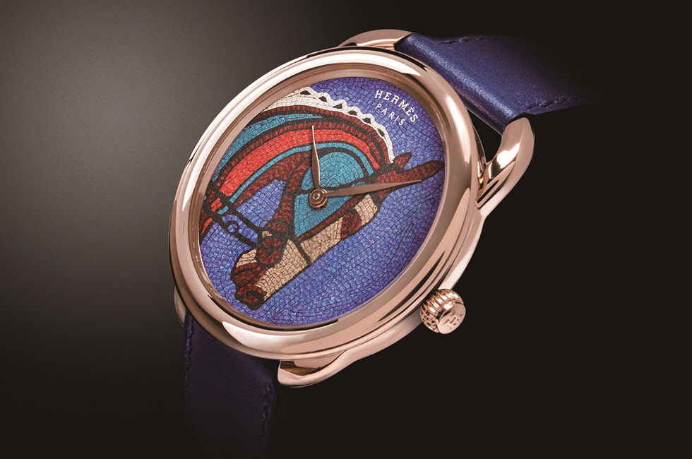 2천2백 개의 작은 사각형 가죽 조각을 모자이크처럼 이어 붙여 말의 옆모습을 형상화한 예술적인 다이얼이 아름답다. 다이얼과 송아지가죽 스트랩까지 청명한 블루 컬러로 통일해 더욱 돋보이는 이 시계는 12개의 리미티드 에디션으로 선보여 소장 가치도 높다.